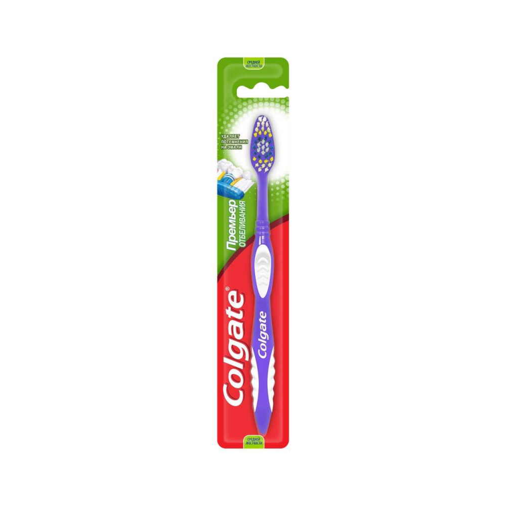 Colgate Премьер Отбеливания тіс щеткасының ерекше дөңгелек түкшелері эмальдағы қоюлау дақтарын жоюға көмектеседі, ал тіл тазалауға арналған төсем ауыздағы жағымсыз иіс тудыратын бактерияларды жоюға көмектеседі.