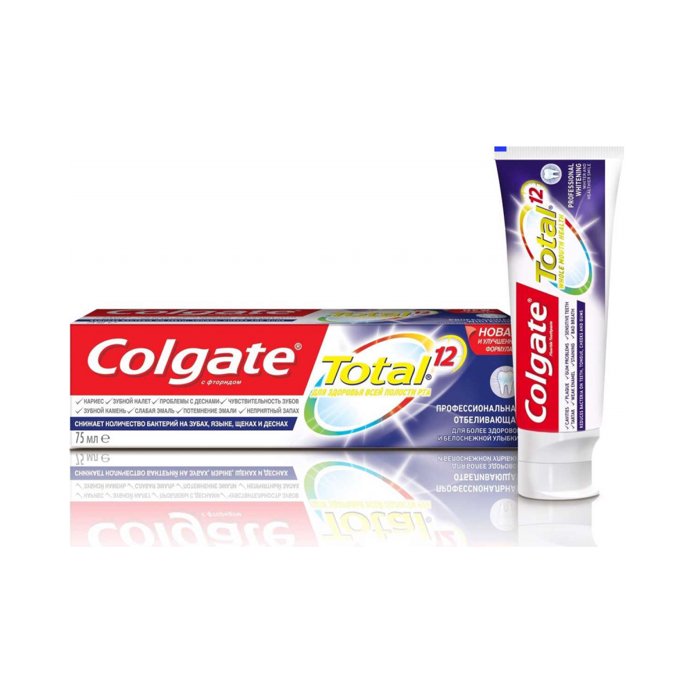 Для обеспечения здоровья всей полости рта необходима комплексная защита, а не только забота о зубах. Поэтому Colgate Total 12 Чистая Мята проактивно борется с бактериями не только на зубах, но и на языке, щеках и деснах в течение 12 часов*, обеспечивая здоровье всей полости рта. Почувствуйте разницу с уверенной, яркой и здоровой улыбкой! • Colgate Total 12 Чистая Мята содержит передовую формулу с Цинком и Аргинином - Цинк борется с бактериями, создавая защитный минеральный барьер, а Аргинин ослабляет структуру зубного налета и улучшает проникновение цинка • Она борется с бактериями не только на зубах, но и на языке, щеках и деснах в течение 12 часов* • Новая формула обладает большим, чем когда-либо количеством преимуществ. Это значит, что это лучшая зубная паста для здоровья всей полости рта в линейке Colgate** • Обеспечивает превосходную защиту от налета, признаков воспаления десен, потемнений на эмали, зубного камня и кариеса, а также обеспечивает дополнительные преимущества - борьбу с бактериями для за
